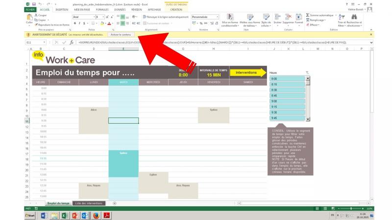 Pour activer le contenu, il faut cliquer sur le champ « Activer le contenu » indiqué par la flèche rouge ci-dessous :