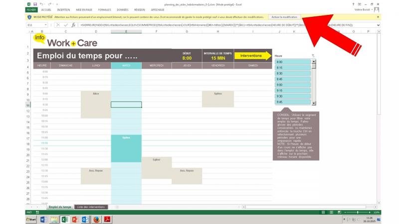 Pour passer d’un onglet à l’autre, on peut soit cliquer tout en bas de la feuille de calcul, soit cliquer sur la flèche jaune située en haut à droite du tableau, intitulée « Interventions » (dans l’onglet « Emploi du temps ») ou « Planning » (dans l’onglet « Liste des interventions »).